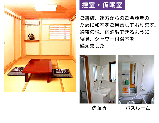 ホール、法要室、控室(仮眠室、浴室、シャワー付)、音響・照明設備、全室冷暖房完備、駐車場